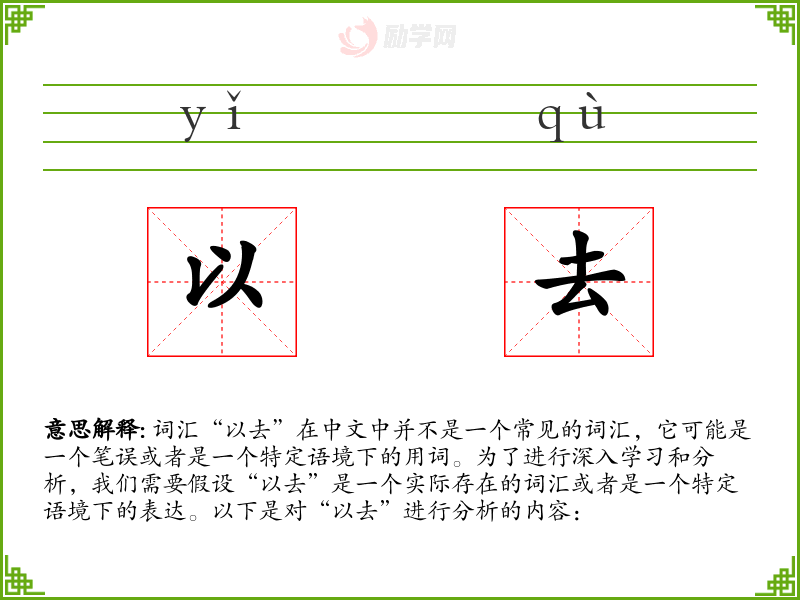 词汇“以去”在中文中并不是一个常见的词汇,它可能是一个笔误或者是一个特定语境下的用词。为了进行深入学习和分析,我们需要假设“以去”是一个实际存在的词汇或者是一个特定语境下的表达。以下是对“以去”进行分析的内容: