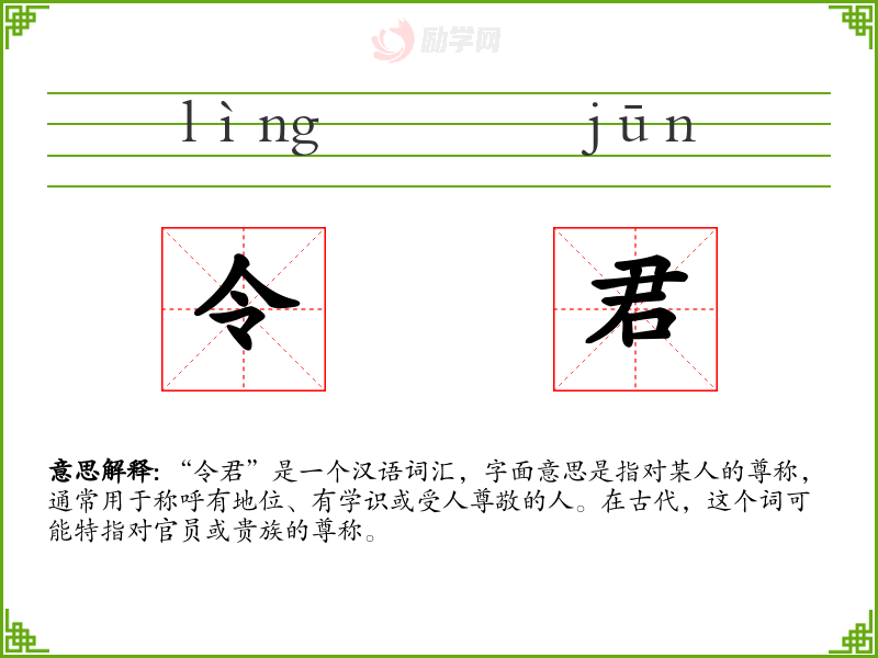 “令君”是一个汉语词汇,字面意思是指对某人的尊称,通常用于称呼有地位、有学识或受人尊敬的人。在古代,这个词可能特指对官员或贵族的尊称。
