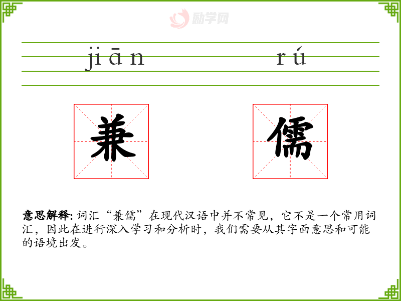 词汇“兼儒”在现代汉语中并不常见,它不是一个常用词汇,因此在进行深入学*和分析时,我们需要从其字面意思和可能的语境出发。
