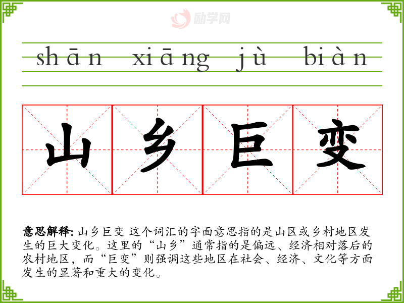 山乡巨变 这个词汇的字面意思指的是山区或乡村地区发生的巨大变化。这里的“山乡”通常指的是偏远、经济相对落后的农村地区,而“巨变”则强调这些地区在社会、经济、文化等方面发生的显著和重大的变化。