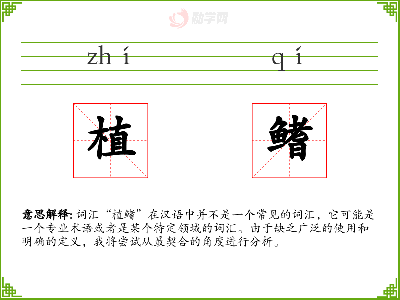 词汇“植鳍”在汉语中并不是一个常见的词汇,它可能是一个专业术语或者是某个特定领域的词汇。由于缺乏广泛的使用和明确的定义,我将尝试从最契合的角度进行分析。