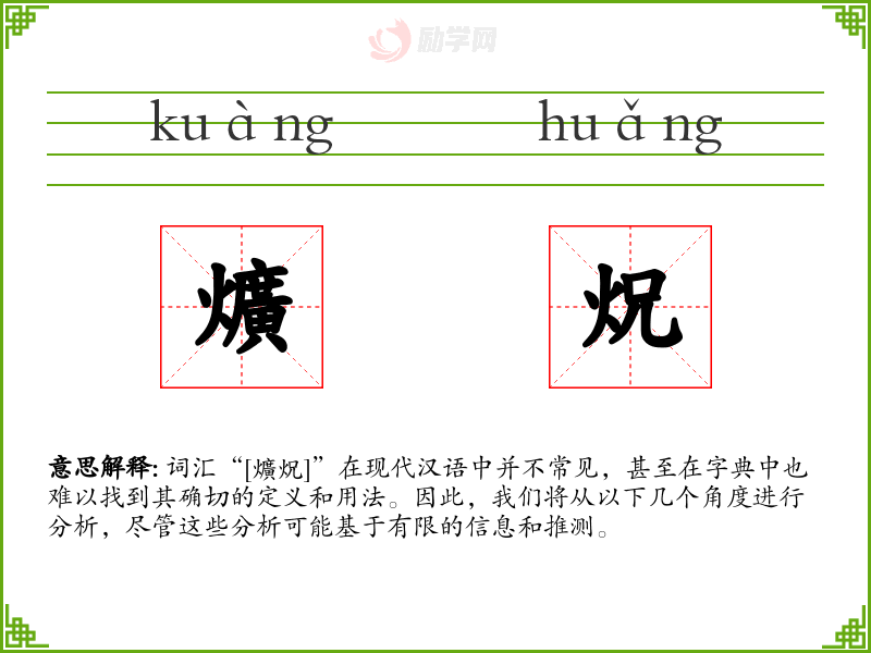 总的来说,词汇“[爌炾]”在现代汉语中并不常见,其确切的含义和用法需要进一步的研究和探索。如果它在古文献或方言中出现,可能需要专业的语言学家或历史学家来解读其含义和用法。