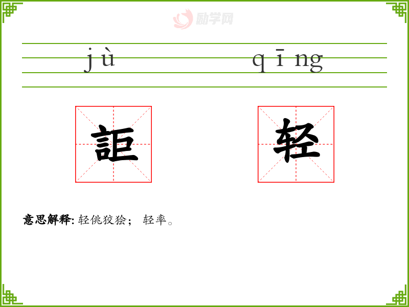 轻[ qīng ] 1. (形声。本义:车名)。 2. 轻车。 【引证】 《说文》。段玉裁注:“轻本车名,故字从车。引申为凡轻重之轻。”-轻,轻车也。 《周礼·车仆》-轻车之萃。谓驰敌致师之车也。 《战国策·齐策》-使轻车锐骑冲雍门。 [更多解释]