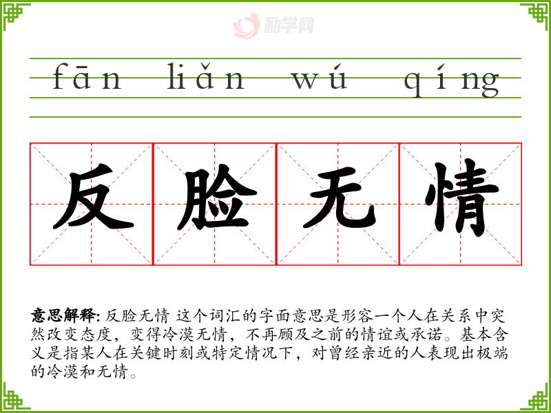 反脸无情 这个词汇的字面意思是形容一个人在关系中突然改变态度,变得冷漠无情,不再顾及之前的情谊或承诺。基本含义是指某人在关键时刻或特定情况下,对曾经亲近的人表现出极端的冷漠和无情。