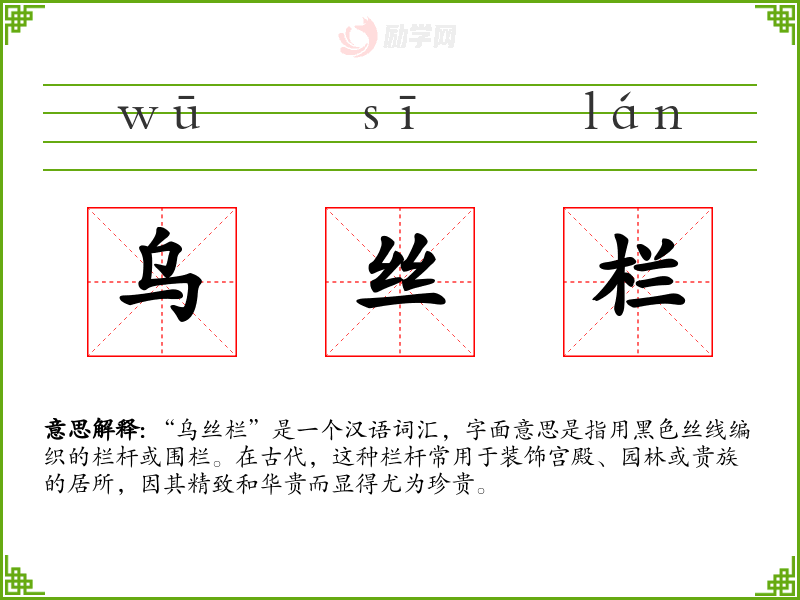 - 反义词:木栏、铁栏(更常见于普通建筑,不如乌丝栏精致)