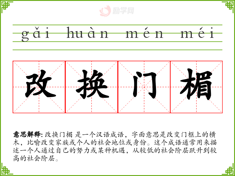 改换门楣 是一个汉语成语,字面意思是改变门框上的横木,比喻改变家族或个人的社会地位或身份。这个成语通常用来描述一个人通过自己的努力或某种机遇,从较低的社会阶层跃升到较高的社会阶层。
