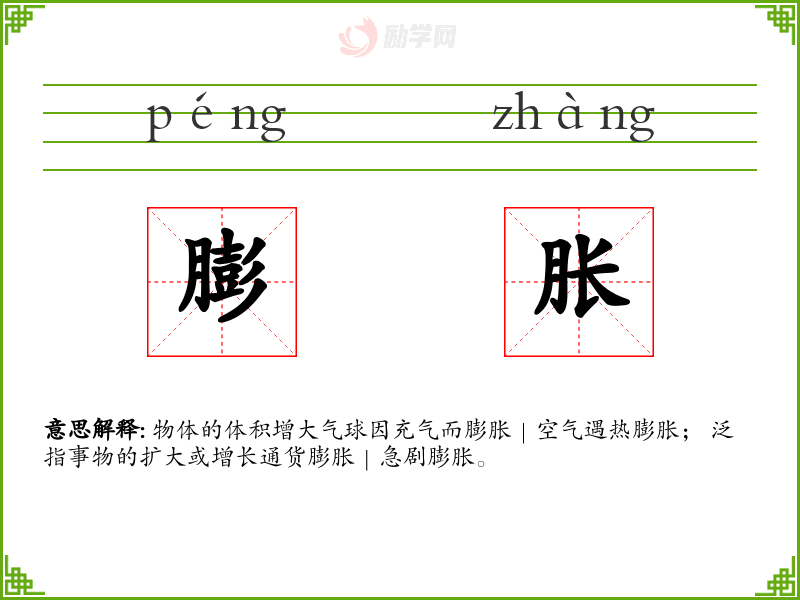 膨胀的意思是:物体的体积增大气球因充气而膨胀|空气遇热膨胀; 泛指事物的扩大或增长通货膨胀|急剧膨胀。