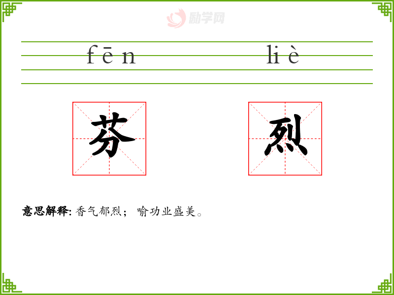 芬烈的意思是:香气郁烈; 喻功业盛美。