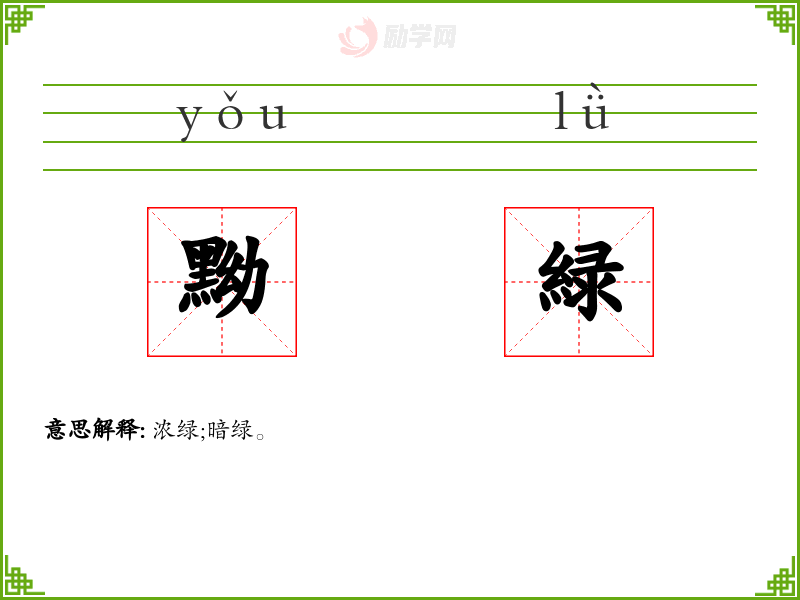 1.浓绿;暗绿。