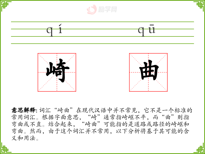 词汇“崎曲”在现代汉语中并不常见,它不是一个标准的常用词汇。根据字面意思,“崎”通常指崎岖不平,而“曲”则指弯曲或不直。结合起来,“崎曲”可能指的是道路或路径的崎岖和弯曲。然而,由于这个词汇并不常用,以下分析将基于其可能的含义和用法。