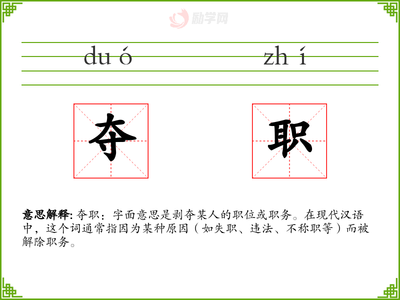 夺职的词源较为直接,由“夺”和“职”两个字组成。在古代汉语中,“夺”有剥夺、抢夺的意思,“职”指职务或职位。随着时间的推移,这个词的含义和用法基本保持稳定。