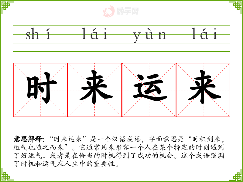 “时来运来”是一个汉语成语,字面意思是“时机到来,运气也随之而来”。它通常用来形容一个人在某个特定的时刻遇到了好运气,或者是在恰当的时机得到了成功的机会。这个成语强调了时机和运气在人生中的重要性。