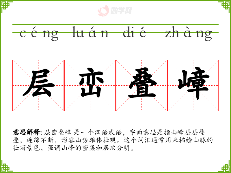 层峦叠嶂 这个词汇源自古代汉语,其构成的每个字都有明确的意义:层(layer)、峦(hill)、叠(pile up)、嶂(barrier)。随着时间的推移,这个词汇的含义和用法基本保持稳定,主要用于文学和描述自然景观。