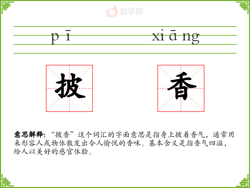 “披香”这个词汇的字面意思是指身上披着香气,通常用来形容人或物体散发出令人愉悦的香味。基本含义是指香气四溢,给人以美好的感官体验。