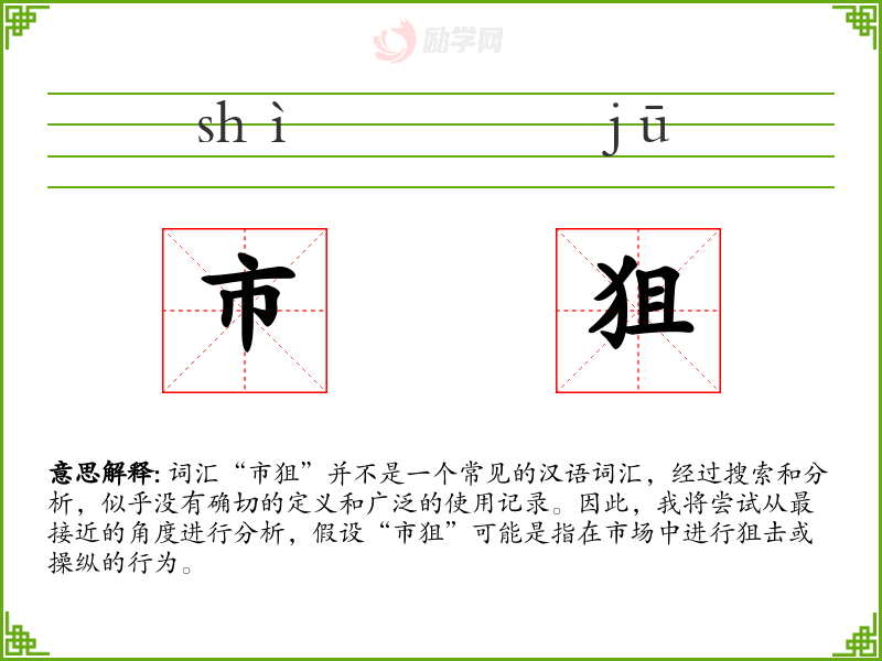 词汇“市狙”并不是一个常见的汉语词汇,经过搜索和分析,似乎没有确切的定义和广泛的使用记录。因此,我将尝试从最接近的角度进行分析,假设“市狙”可能是指在市场中进行狙击或操纵的行为。
