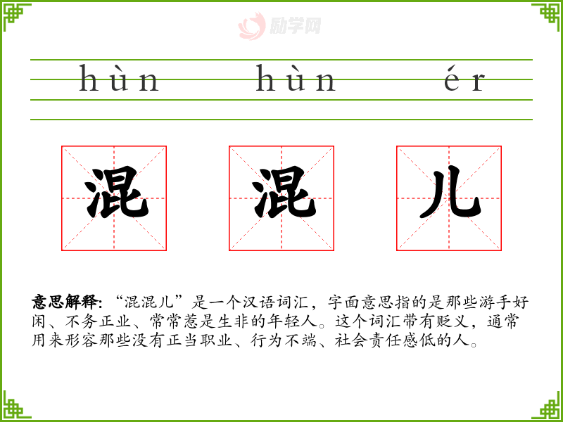 “混混儿”是一个汉语词汇,字面意思指的是那些游手好闲、不务正业、常常惹是生非的年轻人。这个词汇带有贬义,通常用来形容那些没有正当职业、行为不端、社会责任感低的人。