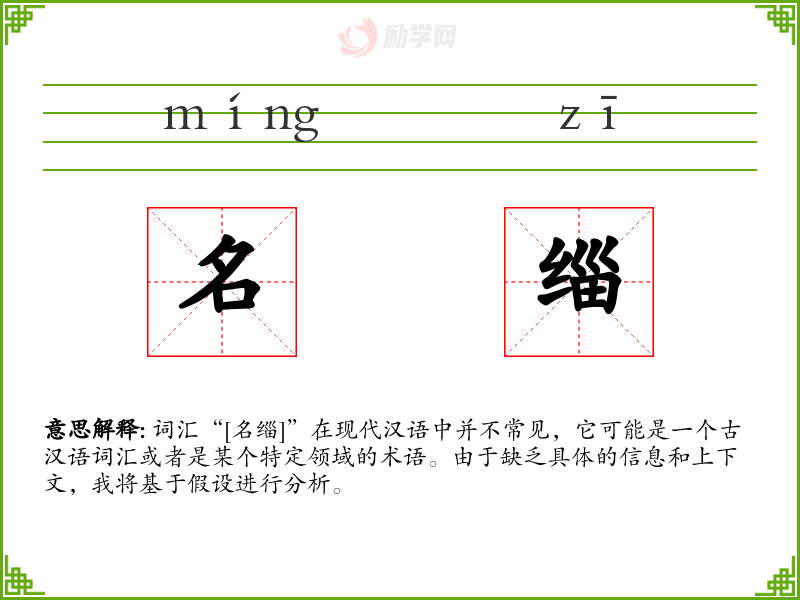 词汇“[名缁]”在现代汉语中并不常见,它可能是一个古汉语词汇或者是某个特定领域的术语。由于缺乏具体的信息和上下文,我将基于假设进行分析。