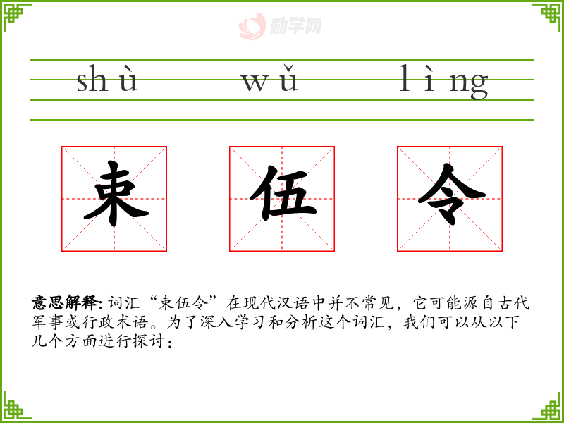 词汇“束伍令”在现代汉语中并不常见,它可能源自古代军事或行政术语。为了深入学*和分析这个词汇,我们可以从以下几个方面进行探讨: