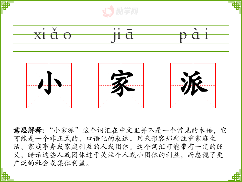 “小家派”这个词汇在中文里并不是一个常见的术语,它可能是一个非正式的、口语化的表达,用来形容那些注重家庭生活、家庭事务或家庭利益的人或团体。这个词汇可能带有一定的贬义,暗示这些人或团体过于关注个人或小团体的利益,而忽视了更广泛的社会或集体利益。