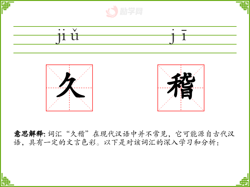 词汇“久稽”在现代汉语中并不常见,它可能源自古代汉语,具有一定的文言色彩。以下是对该词汇的深入学*和分析: