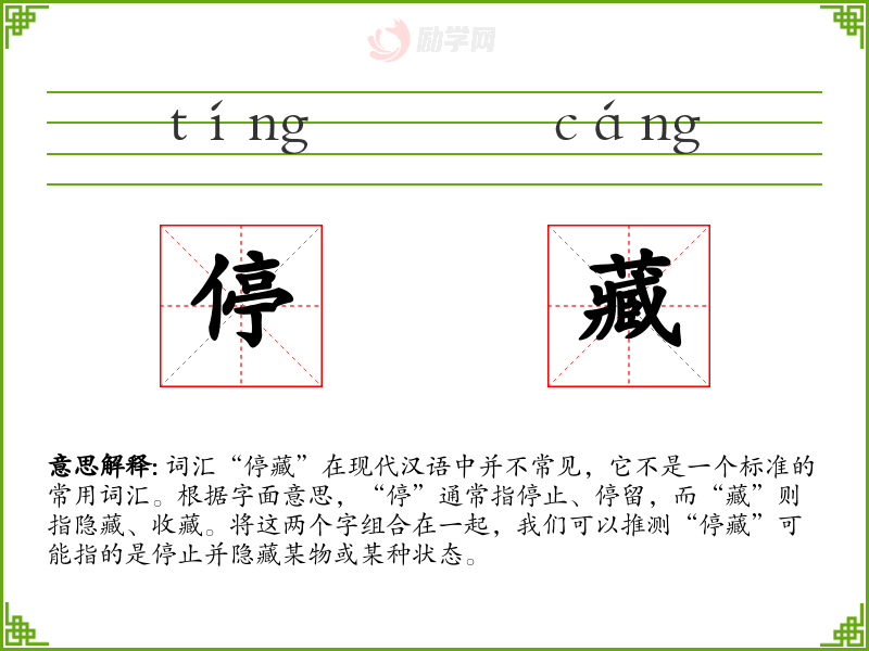 词汇“停藏”在现代汉语中并不常见,它不是一个标准的常用词汇。根据字面意思,“停”通常指停止、停留,而“藏”则指隐藏、收藏。将这两个字组合在一起,我们可以推测“停藏”可能指的是停止并隐藏某物或某种状态。