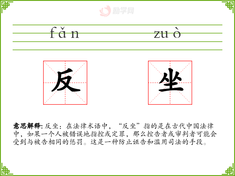 反坐:在法律术语中,“反坐”指的是在古代法律中,如果一个人被错误地指控或定罪,那么控告者或审判者可能会受到与被告相同的惩罚。这是一种防止诬告和**的手段。