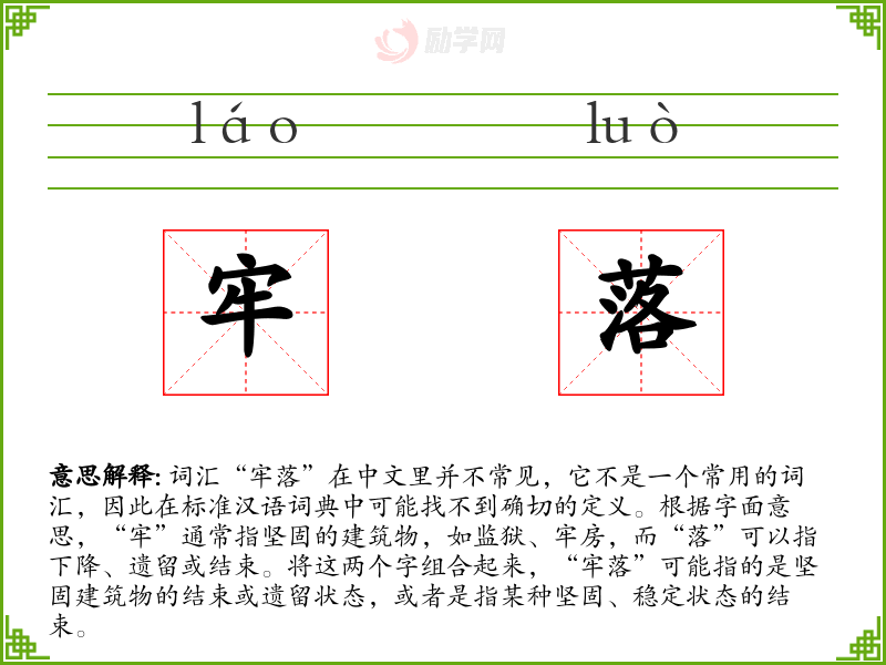 词汇“牢落”在中文里并不常见,它不是一个常用的词汇,因此在标准汉语词典中可能找不到确切的定义。根据字面意思,“牢”通常指坚固的建筑物,如监狱、牢房,而“落”可以指下降、遗留或结束。将这两个字组合起来,“牢落”可能指的是坚固建筑物的结束或遗留状态,或者是指某种坚固、稳定状态的结束。