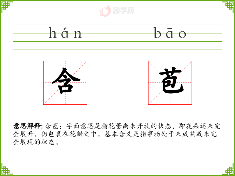 含苞:字面意思是指花蕾尚未开放的状态,即花朵还未完全展开,仍包裹在花瓣之中。基本含义是指事物处于未成熟或未完全展现的状态。