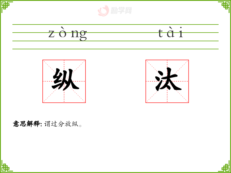 纵[ zòng,zǒng ] 1. (形声。从糸(mì),从声。本义:松缓)。 2. 同本义。 【引证】 《说文》-纵,缓也。 《南齐书》-蓬发施纵,无形仪,不治家业。 【组词】 纵缓、 纵弛 [更多解释]