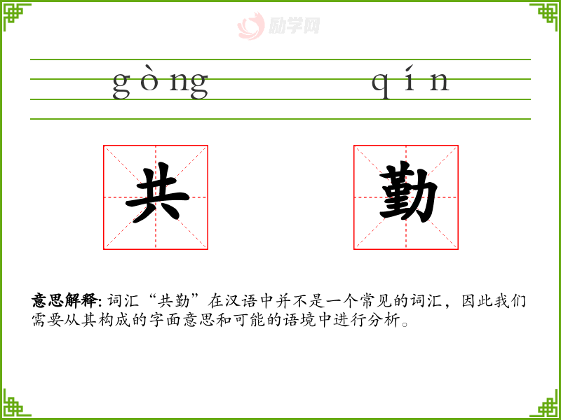 由于“共勤”不是一个常用词汇,其词源和历史演变的信息可能较为有限。它可能是由“共”和“勤”两个常用汉字组合而成的新词,用以表达特定的意义。