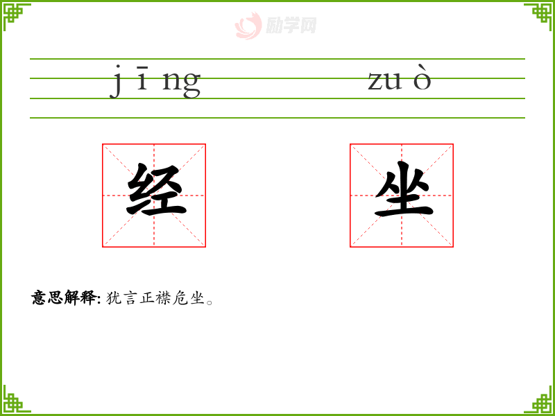 林义光《文源》-像二人对坐土形。 《礼记·曲记》。疏:“坐通名跪,跪名不通坐也。”-坐而迁之。 《礼记·玉藻》-退而坐,取屦。 《礼记·少仪》-受立、授立,不坐。 《礼记·乐记》。疏:“坐,跪也。”-武坐致右宪王。 《左传·昭公二十六年》。注:“膝行也。”按,坐者,尻也,处也。古席地而坐,膝着席而下其臀曰坐,耸其体曰跪。跪,亦谓之启。跪可言坐,坐不可言跪也。-坐行而入。 《史记·魏公子列传》-侯生坐上坐。 《书·太早上》-坐以待旦。 《礼记·玉藻》-坐如尸。 《史记·项羽本纪》-项王、项伯东向坐,亚夫南向坐。 《战国策·魏策》-先生坐!何至于此!寡人喻矣。 《论语·乡党》-席不正不坐。 《汉书·赵尹韩张两王传》-坐语未讫。
