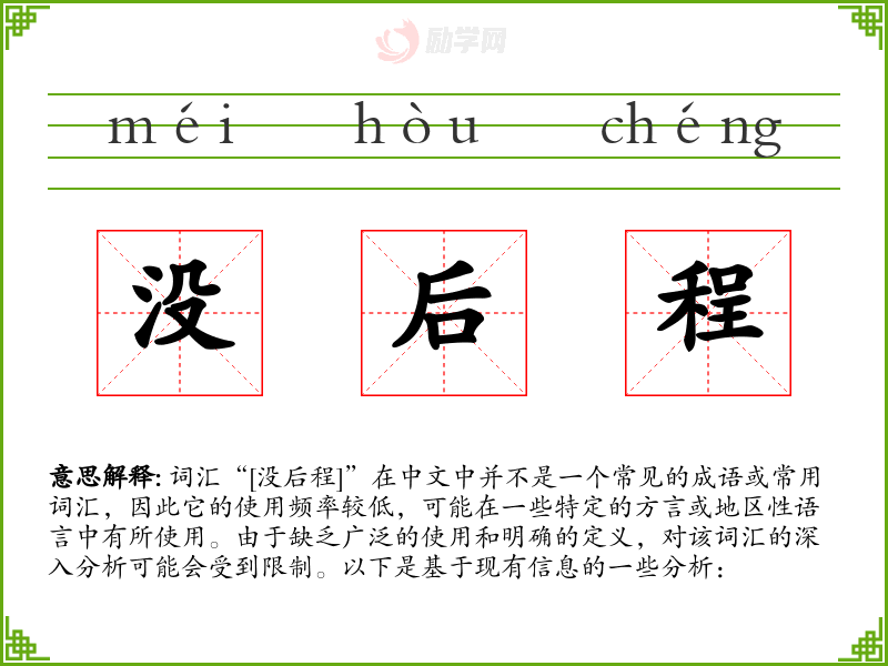 由于“[没后程]”不是一个标准词汇,我们无法对其进行深入的理解和总结。在语言学习和表达中,重要的是掌握和使用标准的、广泛接受的词汇,以确保沟通的准确性和有效性。