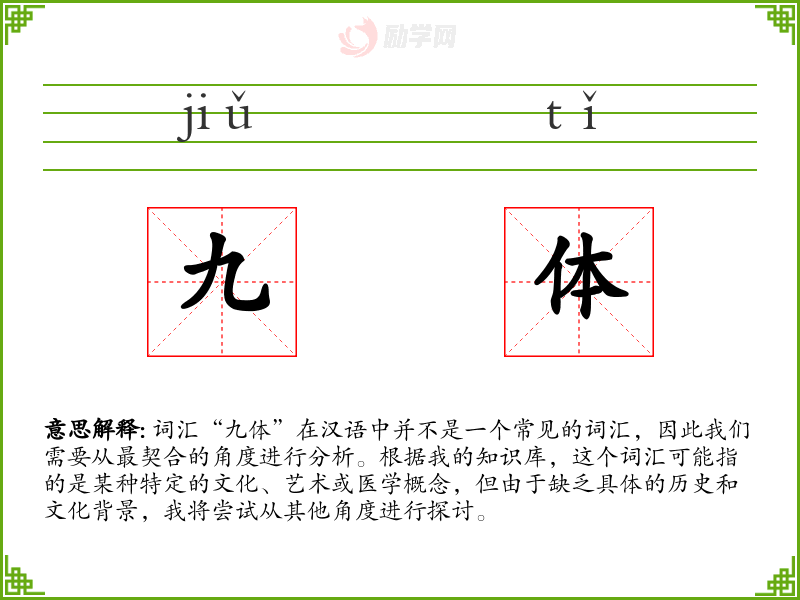 由于“九体”不是一个常见的词汇,它在文学、口语和专业领域中的使用可能非常有限。如果存在,它可能出现在特定的文化或历史文献中。