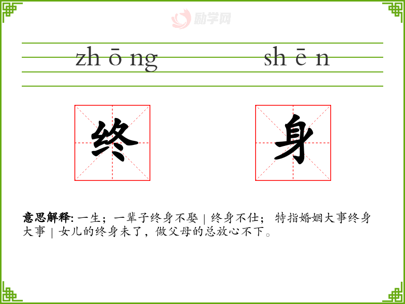 终身的意思是:一生;一辈子终身不娶|终身不仕; 特指婚姻大事终身大事|女儿的终身未了,做父母的总放心不下。