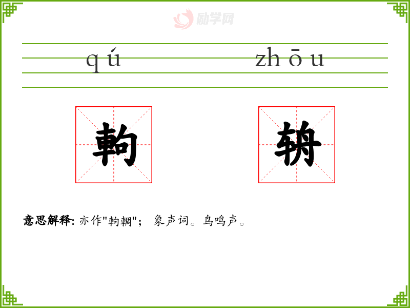 1.亦作"軥輖"; 象声词。鸟鸣声。