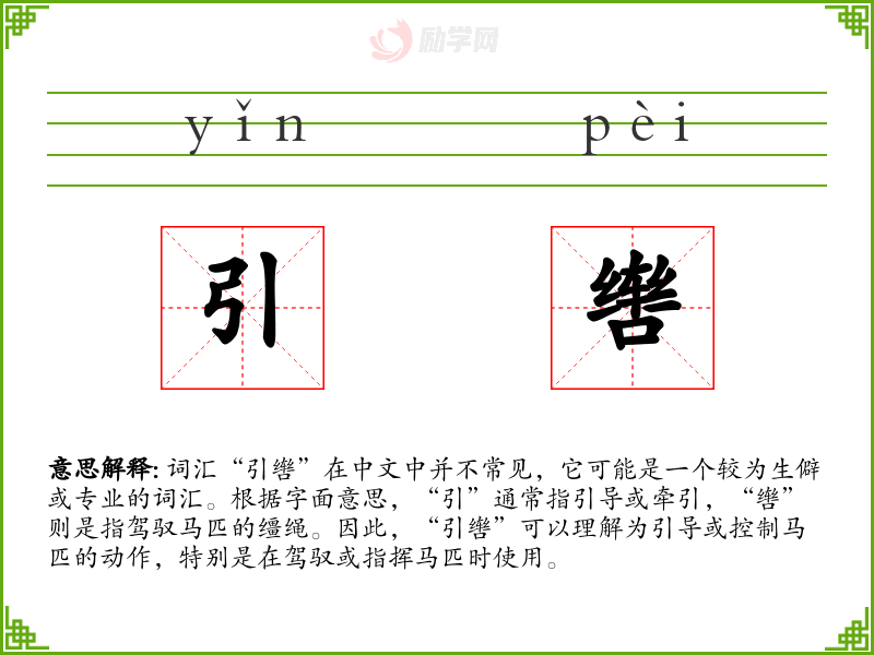 词汇“引辔”在中文中并不常见,它可能是一个较为生僻或专业的词汇。根据字面意思,“引”通常指引导或牵引,“辔”则是指驾驭马匹的缰绳。因此,“引辔”可以理解为引导或控制马匹的动作,特别是在驾驭或指挥马匹时使用。