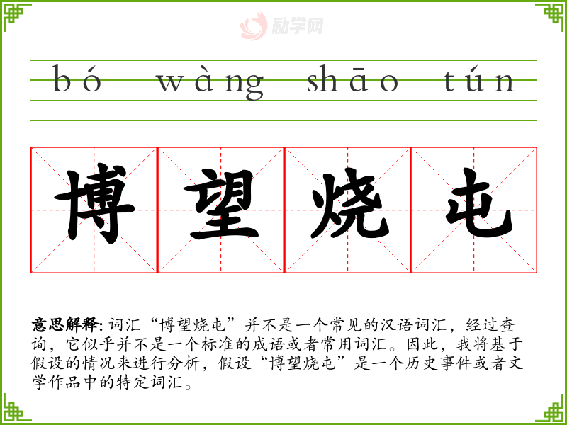 词汇“博望烧屯”并不是一个常见的汉语词汇,经过查询,它似乎并不是一个标准的成语或者常用词汇。因此,我将基于假设的情况来进行分析,假设“博望烧屯”是一个历史**或者文学作品中的特定词汇。