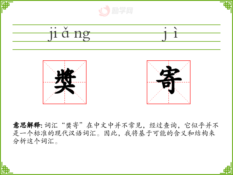 词汇“奬寄”在中文中并不常见,经过查询,它似乎并不是一个标准的现代汉语词汇。因此,我将基于可能的含义和结构来分析这个词汇。
