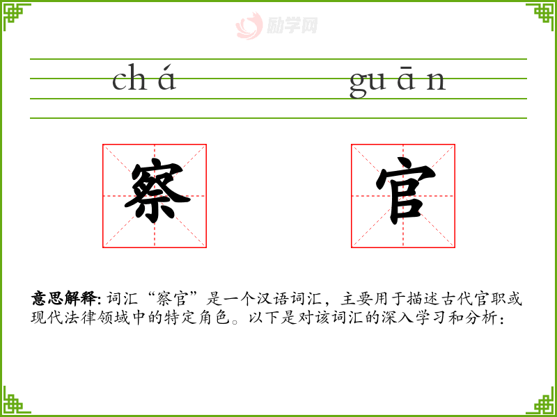 词汇“察官”是一个汉语词汇,主要用于描述古代官职或现代法律领域中的特定角色。以下是对该词汇的深入学*和分析: