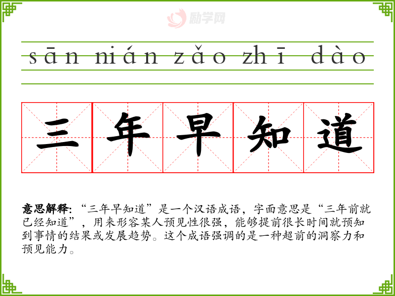 “三年早知道”这个成语在汉语中是一个富有文化内涵的表达,它不仅描述了预见性,还体现了对智慧和能力的尊重。在学*语言和表达时,理解和正确使用这样的成语可以增强语言的丰富性和表达的深度。