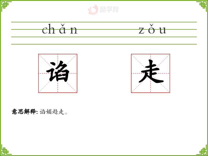 《说文》-走,趋也。 《诗·大雅·緜》-来朝走马。 《仪礼·士相见礼》-某将走见。 《左传·昭公二十三年》-险其走。 《吕氏春秋·期贤》-若蝉之走明火也。 《大戴礼记·诸侯迁庙》-在位者皆反走辟。 《韩非子·喻老》-扁鹊望桓侯而还走。 《韩非子·五蠹》-兔走触株,折颈而死。 《山海经·海外北经》-夸父与日逐走。 《乐府诗集·木兰诗》-双兔傍地走。 明·袁宏道《满井游记》-飞沙走砾。 明·宋濂《送东阳马生序》-录毕,走送之,不敢稍愈约。 《虞初新志·秋声诗自序》-几欲先走。