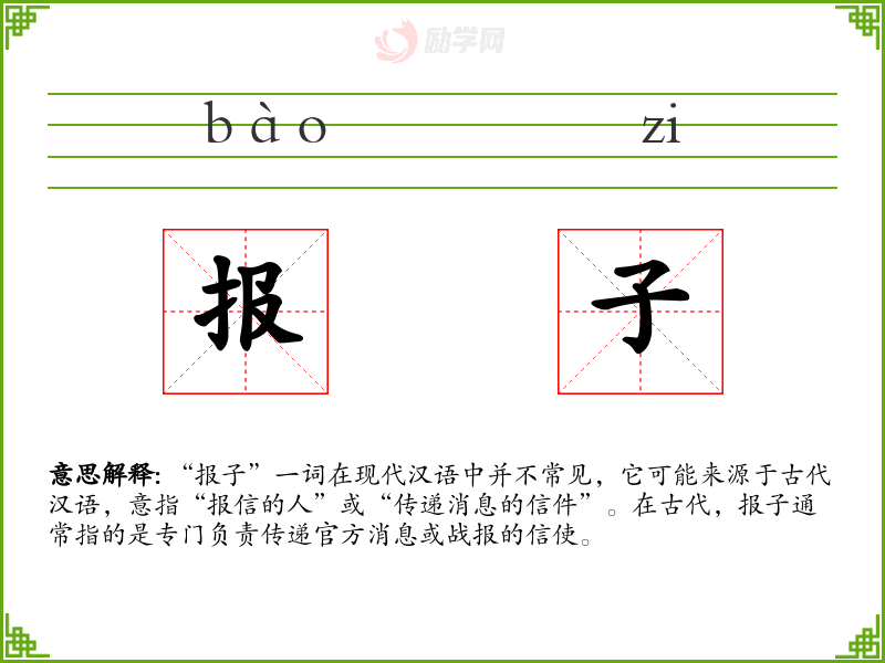 “报子”一词在现代汉语中并不常见,它可能来源于古代汉语,意指“报信的人”或“传递消息的信件”。在古代,报子通常指的是专门负责传递官方消息或战报的信使。