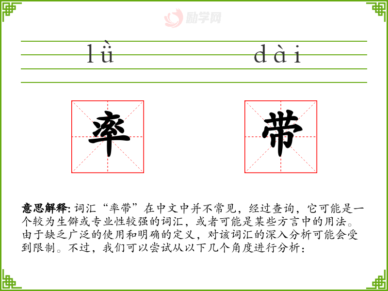 由于“率带”不是一个标准的中文词汇,我们无法给出一个确切的字面意思和基本含义。它可能是某个特定领域或方言中的术语,需要具体的上下文来确定其意义。