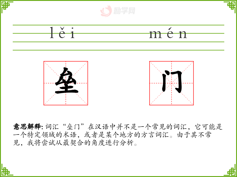 词汇“垒门”在汉语中并不是一个常见的词汇,它可能是一个特定领域的术语,或者是某个地方的方言词汇。由于其不常见,我将尝试从最契合的角度进行分析。