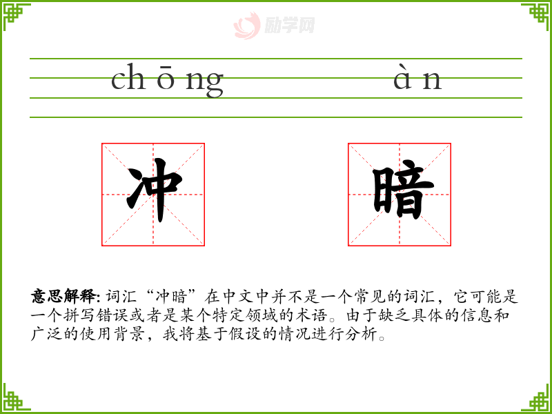 如果“冲暗”是一个词汇,它可能是由“冲”和“暗”两个字组合而成的。字面意思可能是“冲破黑暗”或“在黑暗中冲锋”。