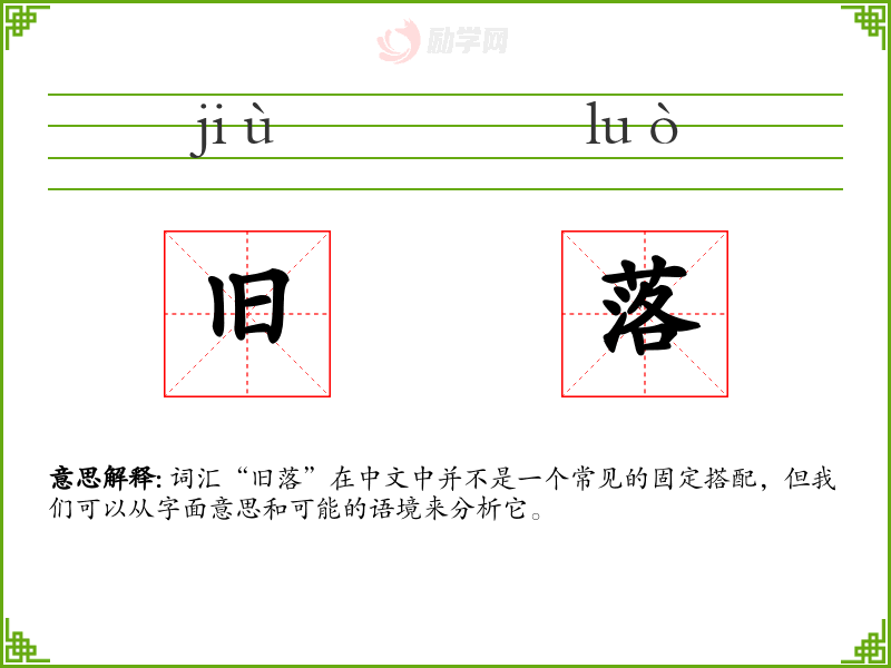 “旧”通常指的是时间上的过去,与“新”相对,表示事物已经存在一段时间,或者已经过时。 “落”可以有多种含义,包括下降、衰败、遗留等。 结合起来,“旧落”可能指的是旧事物的衰败或遗留,或者是指旧时代的遗迹。