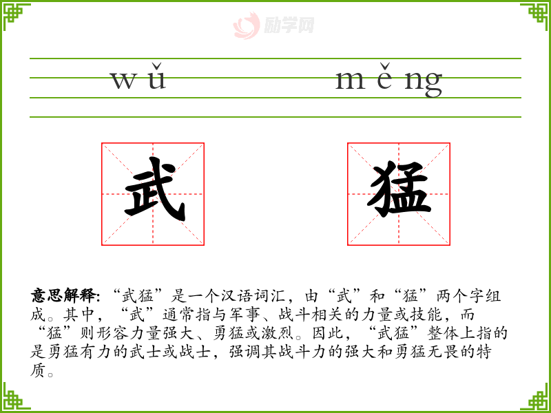 “武猛”这个词在描述勇敢和力量时非常有用,它不仅传达了物理上的强大,还包含了精神和道德上的崇高。在学*汉语和理解**文化时,了解和使用这样的词汇是非常重要的。