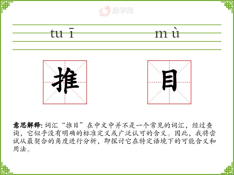 词汇“推目”在中文中并不是一个常见的词汇,经过查询,它似乎没有明确的标准定义或广泛认可的含义。因此,我将尝试从最契合的角度进行分析,即探讨它在特定语境下的可能含义和用法。