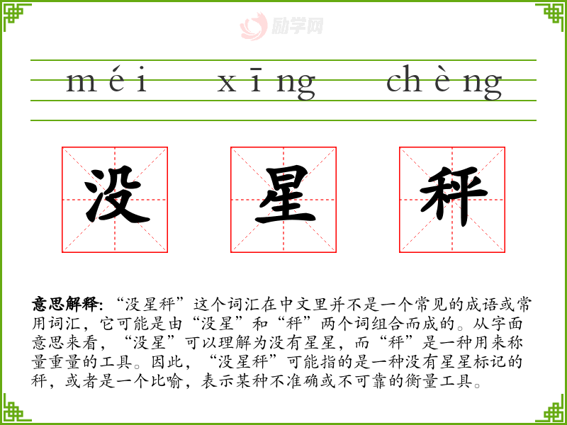 “没星秤”这个词汇在中文里并不是一个常见的成语或常用词汇,它可能是由“没星”和“秤”两个词组合而成的。从字面意思来看,“没星”可以理解为没有星星,而“秤”是一种用来称量重量的工具。因此,“没星秤”可能指的是一种没有星星标记的秤,或者是一个比喻,表示某种不准确或不可靠的衡量工具。