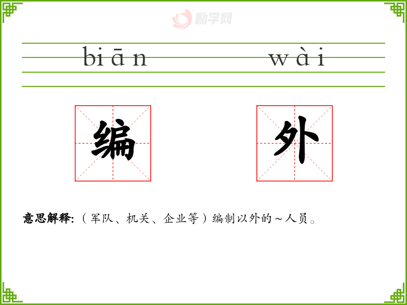 编外的意思是:(军队、机关、企业等)编制以外的~人员。
